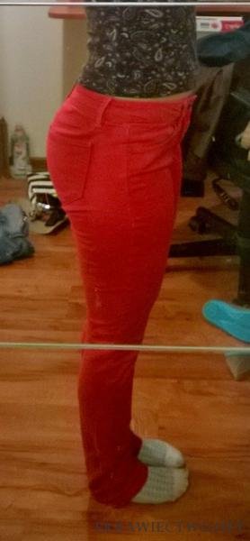 Moim zdaniem czerwone spodnie sa odrobine opiete na poziomie pupy i je rozciaga na boki.