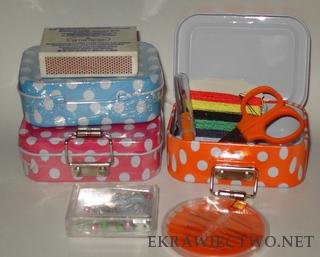 Przybornik krawiecki w metalowym pudełeczku w kropki. Super na wyjazdy bo stabilnie zamykany, na prezent fikuśny na Walentynki, no i śliczniusi. Wielkość 8cm/6cm/2,8cm czyli takie dwa grubsze pudełka zapałek. W środku malutkie nożyczki, siedem kolorów nici nawiniętych na kartonik, zestaw 16 igieł w etui, prujka i w plastikowym pudełeczku 12 szpltek z kolorowymi główkami, 6 guziczków malutkich, 6 zatrzasek, 6 agrafek, 4 haftki. Trzy kolory pomarańcz, róż, niebieski. Druga rzecz to automatyczny nawlekacz igieł. Wsadza się igłę w tulejkę dziurką do dołu, nitkę opiera w zagłębienie, naciska z boku na rączkę, wychodzi pętelka, którą wyciągamy a potem igłę wyciągamy już z nitką! Moje oczy i drżące ręce nareszcie odpoczną! --- Ostatnio edytowane 2012-01-21 19:27:52 przez graginka --- ________________________________________________________