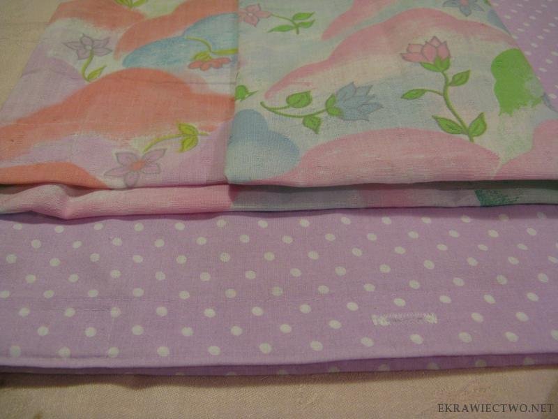 Pokazuję moje jasie. W kropki to z tego przeciągniętego materiału. Na zdjęciu tego nie widać, ale jak na niego patrzę, to mi w oczach krzywo, a przecież jest prosty i ja to wiem... Mam jeszcze kawałek, na jedną stronę jasia. Te w chmurki mam trzy w różnych wersjach kolorystycznych: dwa są równe z obu stron, choć różnią się między sobą, trzeci (na zdjęciu) ma jedną stronę z resztki pierwszego, drugą z resztki drugiego. Wszystkie mi się podobają. Jak śpię, mam głowę w chmurach...