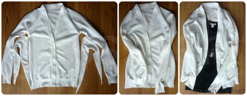 Fajna , nowa , tkanina to oryginalny polartec był tylko rozmiar XL. Odprułem rękawy i otworzyłem szwy po bokach. Ramion nie ruszałem - za dużo roboty by było. Przyciąłem trochę po bokach i na lini wszywania rekawu , zszyłem. Na koniec skróciłem na dole. Co prawda od środka nie było tak estetycznie jak z fabryki ale mniejsza o to. Te kieszenie po bokach nie będą przeszkadzały ? ________________________________________________________