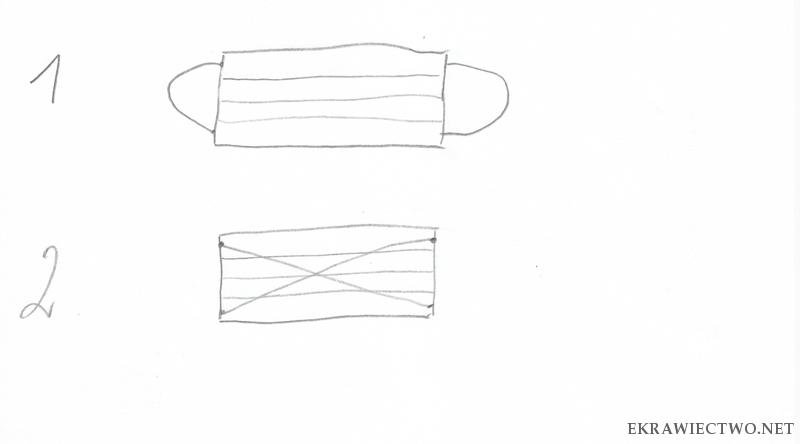 Spróbuję wyjaśnić. Najczęściej gumki, długości do 20 cm, przyszywa się, mocuje, każdą z jednej strony maseczki. Te gumki zaczepia się o uszy. Te moje, zmodyfikowane, mają dłuższe gumki, ok. 29 cm, i każda z nich jest jednym końcem przyszyta do jednej górnej strony maseczki (np.po lewej stronie twarzy), drugim końcem do dolnej drugiej strony maseczki (po prawej stronie twarzy). Druga gumka odwrotnie: od od dolnej lewej strony do górnej prawej strony. Gumek nie zaczepiamy o uszy, tylko przekładamy na tył głowy. Zrobiłam rysunek, może coś rozjaśni. Przepraszam, Susannie chodziło o maseczki wiązane. No to jest proste: troczki mocuje się w czterech miejscach, w tych samych, co gumki, każdy osobno. --- Ostatnio edytowane 2020-04-08 10:52:06 przez violina64 --- |