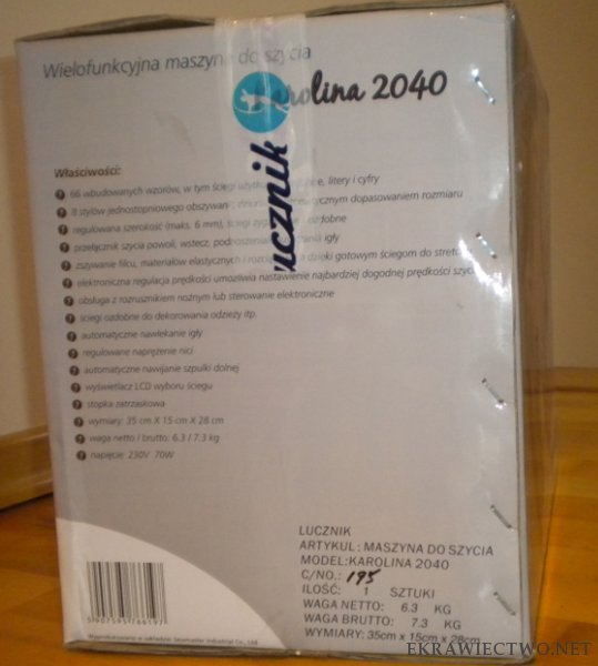 Mam do sprzedania nową maszynę do szycia (oryginalnie zapakowaną - na gwarancji) Firma – Łucznik Model – Karolina 2040 Cena około 950 zł ( do negocjacji ) Możliwość odebrania – Lisia Góra (woj małopolskie) – (ewentualnie dowiozę do Tarnowa) Możliwość wysyłki - Kurier-Poczta (jak kto woli do uzgodnienia) Produkt 100% zgodny ze zdjęciami Więcej informacji o produkcie na stronie Łucznika http://www.lucznik.info/products/sewing_machines/for_professionals/karolina_2040 Zainteresowane osoby proszę o kontakt pod numerem telefonu lub email Tel. 514 402 533 E-mail [email protected] --- Ostatnio edytowane 2012-08-13 10:44:02 przez koste3kak --- |