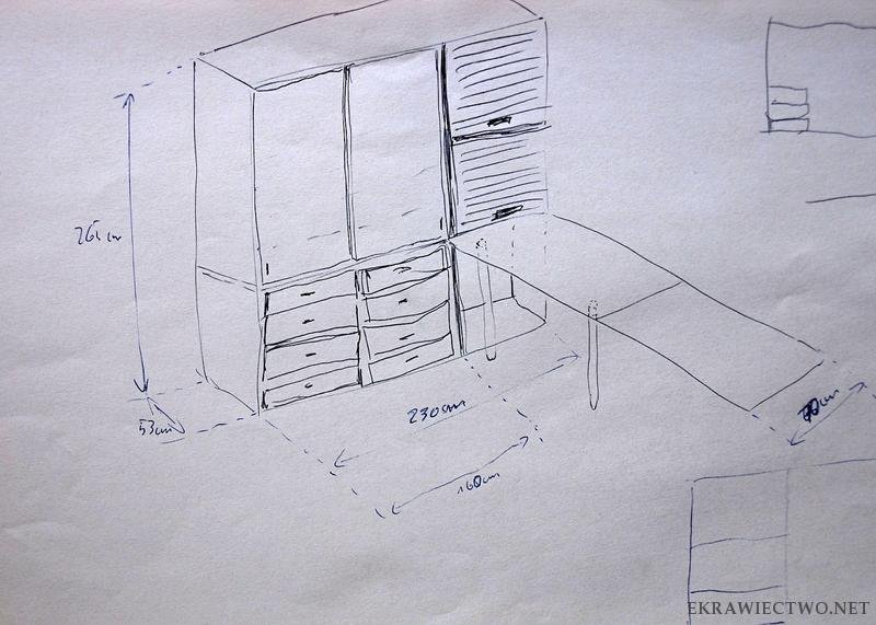 Stąd ten pomysł wysuwanej sekcji, aby ułatwić dostęp do wiszących rzędem ubrań z boku, bo kiedy wiszą frontami to też nie jest za wygodnie - trzeba wyjąć kilka rzeczy, żeby dokopać się do tego, co jest z tyłu. Dlatego min. głębokość szafy do wieszania rzędem wzdłuż to 60 cm. W tym przypadku może być inaczej, skoro to ma być szafa tylko na lżejsze rzeczy, szczególnie damskie, czyli o węższych ramionach. Ale trzeba zmierzyć wiszący na wieszaku np. żakiet - czy nie będzie za bardzo zmięty na szerokości 50 (od całkowitej głębokości trzeba odjąć grubość drzwi i pleców). Co do szuflad-koszyków - to świetny patent i są chyba do kupienia w Ikei, albo Jysk. Tylko one mają jakieś znormalizowane szerokości i trzeba dostosować szerokości sekcji do ich wymiarów. Na koszulki bawełniane raczej się nie nadadzą, bo będzie się odgniatać siatka, ale dla swetrów to dobre rozwiązanie, bo przewiewne, jeśli nie upcha się tych swetrów za dużo Ale u Ciebie widzę, że jest gdzie poszaleć, bo miejsca będzie duuuużo! Z Twojego szkicu jednak wynika, że ta sekcja nad blatem nie bardzo kwalifikuje się do przechowywania często używanych rzeczy, bo dostęp - szczególnie do górnych półek - nie będzie za wygodny... A jak coś wypadnie z szafki prosto do kubka z kawą na stole? Może jestem czarnowidzem Jak coś nowego wykombinuję, to podrzucę Zbych ________________________________________________________